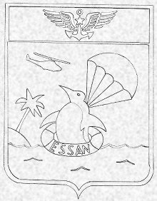 ![]() "Deux tiers de ciel azur et un tiers de mer, un pingouin arrive à la mer en parachute, une bouée à la taille; il guette l'approche d'un hélicoptère de sauvetage venant d'une île, havre symbolique. Sur la bouée apparaît l'intitulé de l'E.S.S.A.N." |