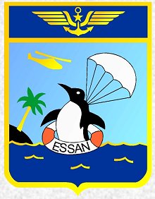 "Ecu bordé d'or, d'azur plus clair chargé au centre d'un pingouin qui amerrit sur une mer ondée. Tourné vers la gauche, équipé d'un parachute et d'une bouée portant l'inscription ESSAN en lettre capitales, il guette l'approche d'un hélicoptère placé en haut à gauche.