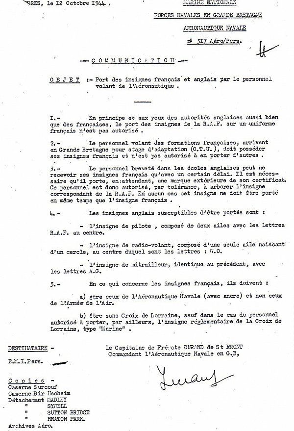 1. La deuxième guerre mondiale 1.1. Les premiers insignes des français libres En 1940 les personnels ayant rallié la France libre sont en nombre insuffisant pour envisager la constitution d'une aéronautique navale. Les pilotes de la marine sont donc dispersés au sein des formations britanniques. Fin 1941 l'effectif français permet la création d'un groupe de chasse mixte air-marine. Ce sera le squadron 340 « Ile de France » dont le commandement est confié au capitaine de corvette de Scitivaux de Greische. Durant toute cette période, les insignes définis en 1917 restent réglementaires. Toutefois selon les formations d'appartenance, les pilotes décident d'y ajouter ou d'y substituer des insignes particuliers. On peut ainsi trouver : -