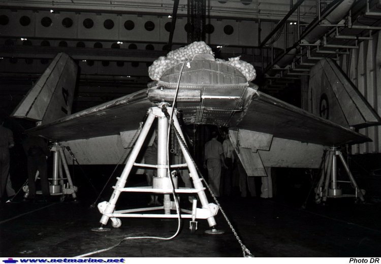 ![]() Preuve des capacités de maintenance à bord des porte-avions, la voilure du Crusader 14 est déposée à bord du Clemenceau, pour permettre une intervention nécessitant l'accès à des collecteurs (1983 - Photo Christian Couesnon-Tessier).