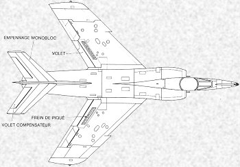 Les empennages : l'empennage horizontal est du type monobloc; il assure en même temps la fonction de profondeur et celle d'amortisseur de tangage. Il comporte un compensateur actionné par un vérin électrique assurant la correction automatique d'altitude au moment de la sortie des volets hypersustentateurs. La dérive à très forte flèche (63°) supporte la prise Pitot et renferme les antennes VHF/UHF et UHF. Le gouvernail à servo-commande remplit également la fonction d'amortisseur de lacet.
