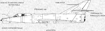 Le train d'atterrissage possède une voie de 3,5 m et un empattement de 4,8 m. il est à commande hydraulique, équipé d'amortisseurs à longue course et de pneumatiques à haute pression (10 kgp) afin d'encaisser des vitesses d'impact vertical de l'ordre de 6 m/s. Le train avant, quant à lui, permet de cabrer l'avion à 10° pour les opérations de catapultage. L'armement de bord comprend deux canons DEFA 552 de 30 mm (cadence de tir:1100-1500 coups/min.; vitesse initiale: 815 m/s) approvisionnés par 120 obus chacun. Ces deux armes sont montées sur un châssis amovible, ce qui facilite les opérations de réarmement. L'armement externe se répartit sur les quatre points d'attache sous voilure. Les deux points internes permettent l'emport de missiles air-surface AS-20 ou AS-30, de bombes de 454 kg, de bombes à carburant gélifié de 500 litres, ou de réservoirs pendulaires de 625 litres. Les deux points externes, eux, peuvent recevoir des bombes de 225 kg, des lance-roquettes Matra 116 pour 19 roquettes SNEB de 68mm, des lance-roquettes pour 6 roquettes HVAR de 127 mm ou des missiles air-air AIM-9 Sidewinder. Un cinquième point d'attache est prévu sous le fuselage. Il permet l'installation d'une nacelle de ravitaillement en vol Douglas. Cette nacelle est munie d'un petit moulinet aérodynamique entraînant une pompe de transfert, un tuyau souple et un cône de stabilisation. ![]() [Sommaire Etendard IVM] [Sommaire Net-Marine] |