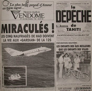 Le 3 décembre 1991, l'Alouette III se crashe sur la piste de Temae, sans faire de victime heureusement. Une chute "en douceur" de quelques mètres au décollage, mais qui rend le seul hélicoptère du territoire complètement inutilisable. Triste fin pour la seule libellule de la 12S. L'Alouette avait 30 ans. Octobre 1992, ce n'est pas encore Noël, mais c'est bel et bien un miracle qui survient lorsqu'après 20 jours de recherches, un Gardian découvre les 7 passagers d'un kau sur l'atoll de Paraoa (archipel des Tuamotu). Voilà plus de 20 jours que le petit bateau était parti de Vahitahi pour rejoindre Nukutavake, une traversée qui dure normalement 2 heures ! Les Gardian effectueront 33 heures de patrouille, aidés par le Panther du Prairial. Alors que tout espoir semblait perdu, le Gardian de l'EV Dardot repère les naufragés et leur largue un colis de vivre. Une vedette viendra recueillir les "Robinsons". Fin octobre 1992, c'est une opération complexe qui se monte, pour évacuer un gendarme et sa femme gravement brûlés sur l'île de Raivavae. Compte tenu de la distance, l'équipe médicale embarquée à bord du Gardian est transféré à Tubuai sur un Super-Puma du CEP. Direction Raivavae pour un aller-retour, puis embarquement des blessés à bord du Gardian pour un vol vers Tahiti où ils seront hospitalisés.