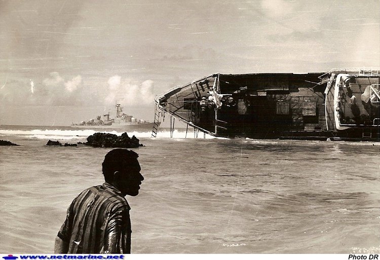 ![]() L'aviso-escorteur Doudart de Lagrée effectue le sauvetage de l'équipage du chalutier sud coréen Nam Haé 222, naufragé sur le récif de corail de Fakarava le 21 octobre 1968. Les photos ont été réalisées par les membres de l'expédition dirigée par le commandat en second Ponselle à laquelle s'était joint le médecin du bord. Après 40 km de traversée du lagon durant 5 heures, l'équipe de secours constatait que le bateau gisait sur le côté et que l'équipage s'était rendu à pied par le récif sur un motu plus abrité. Certains marins étaient profondément blessés aux pieds. L'équipage sud coréen fut transféré sur un autre chalutier et regagna Papeete (remerciements Serge Descroizette).