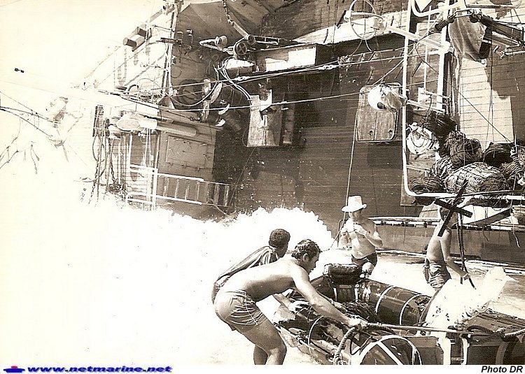 ![]() L'équipage de l'aviso-escorteur Doudart de Lagrée effectue le sauvetage de l'équipage du chalutier sud coréen Nam Haé 222, naufragé sur le récif de corail de Fakarava le 21 octobre 1968. Les photos ont été réalisées par les membres de l'expédition dirigée par le commandant en second Ponselle, à laquelle s'était joint le médecin du bord. Après 40 km de traversée du lagon durant 5 heures, l'équipe de secours constatait que le bateau gisait sur le côté, alors que l'équipage s'était rendu à pied par le récif sur un motu plus abrité. Certains marins étaient profondément blessés aux pieds. L'équipage sud coréen fut transféré sur un autre chalutier et regagna Papeete (remerciements Serge Descroizette).