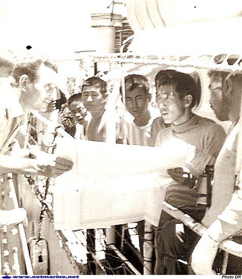 L'aviso-escorteur Doudart de Lagrée effectue le sauvetage de l'équipage du chalutier sud coréen Nam Haé 222, naufragé sur le récif de corail de Fakarava le 21 octobre 1968. Les photos ont été réalisées par les membres de l'expédition dirigée par le commandat en second Ponselle à laquelle s'était joint le médecin du bord. Après 40 km de traversée du lagon durant 5 heures, l'équipe de secours constatait que le bateau gisait sur le côté et que l'équipage s'était rendu à pied par le récif sur un motu plus abrité. Certains marins étaient profondément blessés aux pieds. L'équipage sud coréen fut transféré sur un autre chalutier et regagna Papeete (remerciements Serge Descroizette).