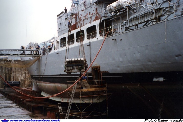 En octobre 1994, débarquement d'un groupe électrogène (partie moteur) du Bātiment de Soutien Mobile (BSM)