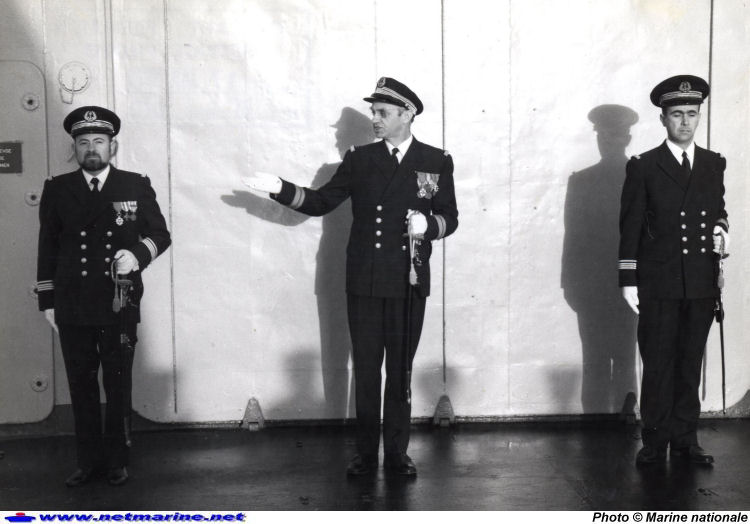 ![]() A bord du Bâtiment de Soutien Mobile (BSM) Loire : De gauche à droite, le capitaine de corvette Rouarch commandant prenant, capitaine de vaisseau Gaborit (commandant l'ESDRA), le capitaine de corvette Gelez, commandant quittant (janvier 1975).