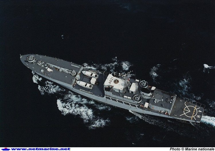 Vue aérienne du BSM Rhin : on distingue nettement les deux chaloupes LCPS, ainsi que les 3 affûts de 40mm.