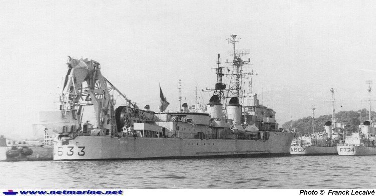 transformé en bâtiment d'expérimentation, à quai à Toulon. Remarquez l'immense portique qui permit d'expérimenter le sonar remorqué à immersion variable (octobre 1969).