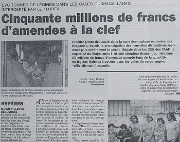 Alors que l'Albatros est en PEI/Permissions (21 novembre au 4 janvier 1998), c'est au tour du Floréal de jouer les gendarmes des TAAF. Le 4 décembre, son hélicoptère Panther repère un navire suspect battant pavillon argentin, le Magallanes I. L'équipe de visite qui est envoyé à bord découvre des preuves suffisantes pour arraisonner le palangrier qui sera ramené à La Réunion le 15 décembre. Le Magallanes I appartient à la société Argenova, filiale de l'armement espagnol Pescanova. Ce palangrier sera le premier à tomber sous le coup des nouvelles dispositions de la loi sur la pêche illégale dans les TAAF et adoptée le 24 septembre par l'Assemblée Nationale. Les amendes sont plus dissuasives. L'armateur devra ainsi débourser 3 millions de francs de caution pour permettre à son navire de quitter La Réunion (50 millions avait été demandés), le 12 janvier 1998, et rallier Port Louis. Sa pêche est vendu aux enchères, c'est le même armateur argentin qui la rachète (!) via une société réunionnaise pour environ 3,7 millions de francs.
