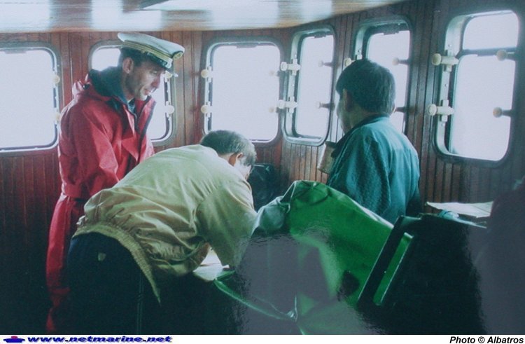 ![]() Moment de tension à bord du patrouilleur Albatros : après avoir arraisonné un palangrier pirate taiwanais, le Ying Mao Hsiang, son capitaine signe le procès-verbal de saisie du navire, en présence du commandant de l'Albatros, le capitaine de frégate Bruno Julien de Zélicourt (mars 1996).