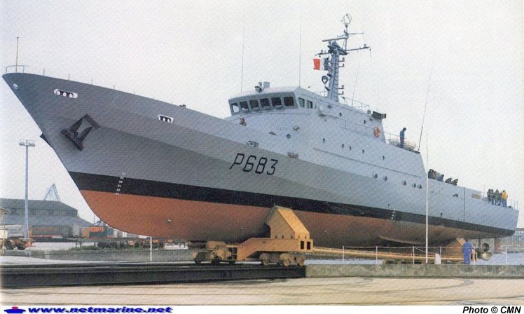 , à sa sortie des chantiers des Constructions Mécaniques de Normandie (mai 1984).