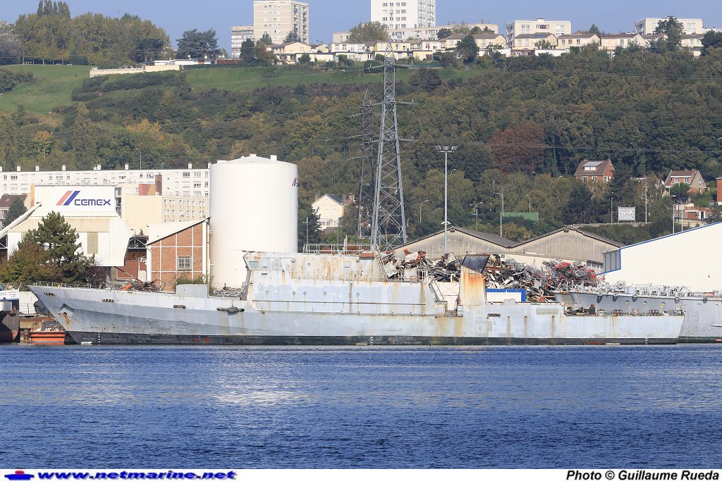 La coque de l'ex patrouilleur La Boudeuse vit ses derniers jours au chantier de démolition Gardet et de Bezennac au Havre ( 11 octobre 2015).
