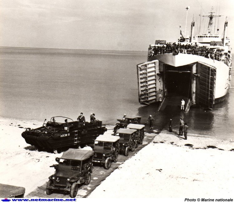 Des véhicules débarquent après passage du « bulldozer tapis » depuis le bâtiment de débarquement de chars (BDC)