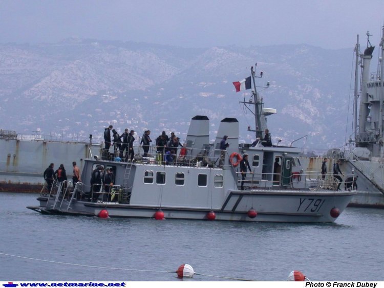 La vedette d'instruction à la plongée Myosotis arrivant sur le plan d'eau de l'Ecole de Plongée avec son flot d'élèves. En arrière-plan, on aperçoit l'ancien BDC Dives servant de brise-lames (15 juin 2005).