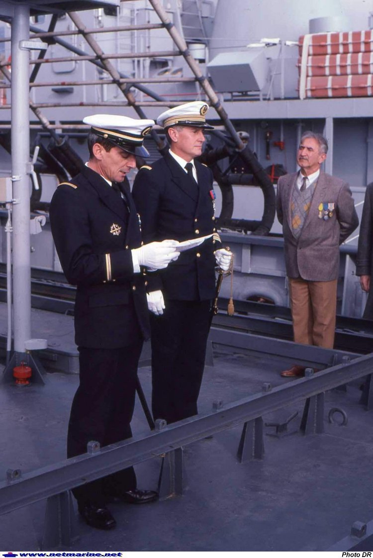 Au cours d'une allocution précédant la dernière cérémonie des couleurs, le maître principal Bourhis, dernier commandant, retrace la vie de Pélican en présence du directeur du port, de certains anciens commandants et de l'équipage (25 novembre 1988 - Photo Norbert Bourhis).