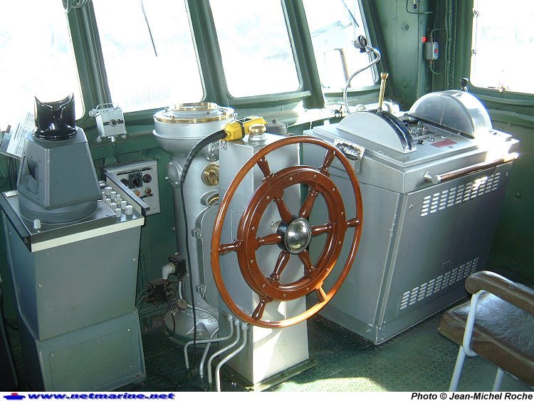 . Radar DECCA RM 914A à gauche, barre à roue et gyrocompas au centre, commandes machine à droite (octobre 2001).