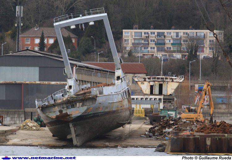 en démolition au sein de la société havraise Gardet et De Bezenac Recycling. Le bloc passerelle a déjà disparu (27 mars 2016).