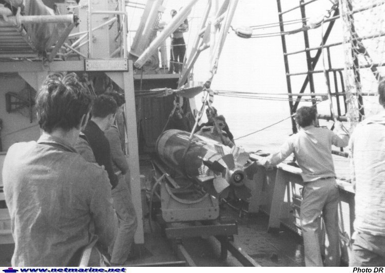 La torpille en cours de transfert sur son chariot de stockage en pontée du