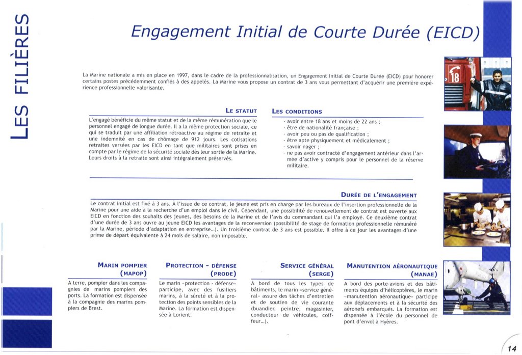Importante évolution du recrutement de la marine nationaleA partir du 1er mars 2008, la filière de recrutement "Engagement directe" de la marine nationale connaitra une évolution importante avec le remplacement des 2 contrats actuels par un seul. A l’heure actuelle, la marine nationale propose 2 durées de contrat initial : l’“engagement initial de courte durée” (EICD : 3 ans) et l’“engagement initial de longue durée” (EILD : 10 ans). A compter du 01/03/08, ces 2 contrats seront remplacés par un contrat unique d’une durée initiale de 4 ans renouvelable : les “quartiers-maîtres et marins de la flotte” (QMF). La durée maximale est cependant limitée à 9 ans. Pour devenir officier-marinier et espérer effectuer une carrière complète dans la marine nationale, le marin devra être sélectionné entre 2 et 6 ans de service pour une version "interne" de l’école de maistrance. Remarque importante : la durée maximale de ce nouveau contrat étant limitée à 9 ans, il ne serait plus éligible à la prime de fin de contrat attribuée actuellement lorsque la fin de service intervient entre 9 et 11 ans.