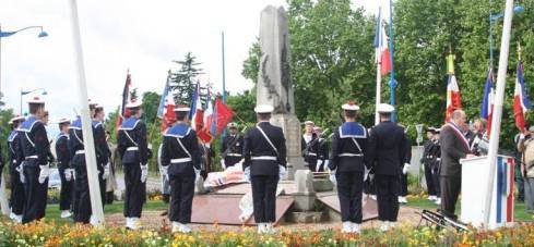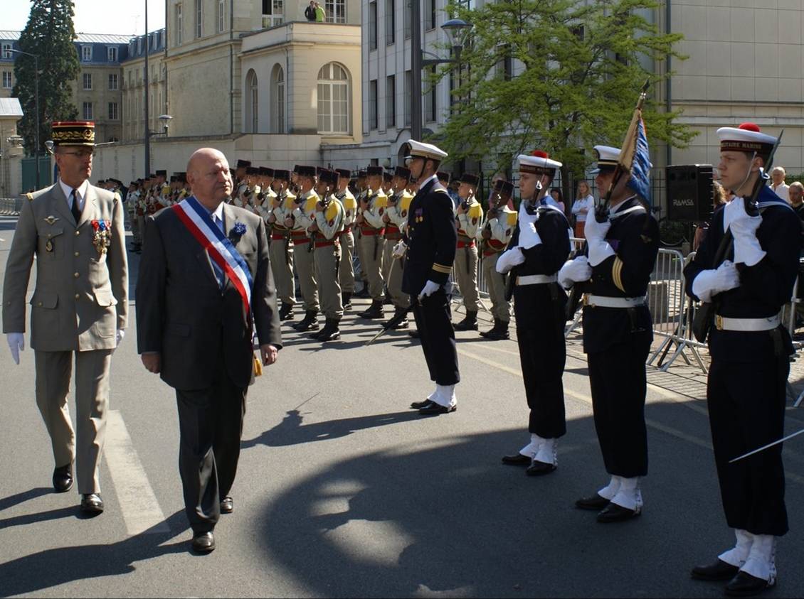 le détachement pour son excellente tenue. Les troupes défilèrent devant le Délégué Militaire Départemental, le général Gérard, commandant l'EMSOME[1] de Rueil-Malmaison et les autorités municipales et départementales civiles et militaires rassemblées. Le Régiment de Marche du Tchad marchait en tête, suivi des marins aux ordres du Capitaine de Corvette (R) Guillaume Wattinne ; la Garde Républicaine fermait la marche. Tenue impeccable de nos marins au "Portez armes", puis exercice difficile imposé par des circonstances inhabituelles et inoubliables : la marche au pas rythmée par le chant de la 1ère companie du RMT, plus lent que le 120 pas minute réglementaire et sans grosse caisse pour retrouver le pas ! Les cérémonies commémoratives organisées de façon décalée à Neuilly-sur-Seine l'après-midi du 10 mai mirent la Marine encore plus en valeur. Le nouveau maire de la ville, Monsieur Jean-Christophe Fromantin, avait voulu les entourer d'un faste inconnu sous la précédente mandature et le Délégué aux Anciens Combattants, Monsieur Jacques Pirson, avait mobilisé la Musique de la Région Terre Île-de-France. La Marine Nationale était la seule à avoir délégué des troupes, sous la forme d'un détachement de la PMM Richelieu, de taille sensiblement équivalente à celle du détachement d'Issy-les-Moulineaux, sous les ordres du Premier Maître (R) Maher Saïdane. Le porte-fanion était le Maître (R) Stéphane Misdariis. La musique marchait en tête, suivie par nos marins, les portes drapeaux, les autorités et le public... Le cheminement méandreux du cortège imposa des manœuvres complexes au cours desquelles nos marins montrèrent une grande maîtrise des mouvements d’ordre serré. Mais un tel contrôle des opérations ne va pas sans un intense travail préparatoire dans les journées qui précèdent. Quand on ne vit pas la chose de l'intérieur, il est difficile d'imaginer le nombre d’impératifs à satisfaire pour le succès d'une telle manifestation : multiples contacts avec les services de la mairie, repérage préalable du parcours, étude de la voirie pour déterminer les positionnements au sol, mobilisation des bonnes volontés pour disposer du nombre de marins voulu au jour dit, préparation du matériel de secours pour parer aux oublis éventuels, sans oublier les réserves d'eau pour parer au coup de chaleur, etc… Heureusement, le temps s'était mis de la partie. Dans les avenues ombragées de la ville de Neuilly, nos marins défilant au pas, le chrome des baïonnettes au canon scintillait en rythme dans le soleil couchant. CC (R) Bertrand Louvet, Assistant Ciram 92